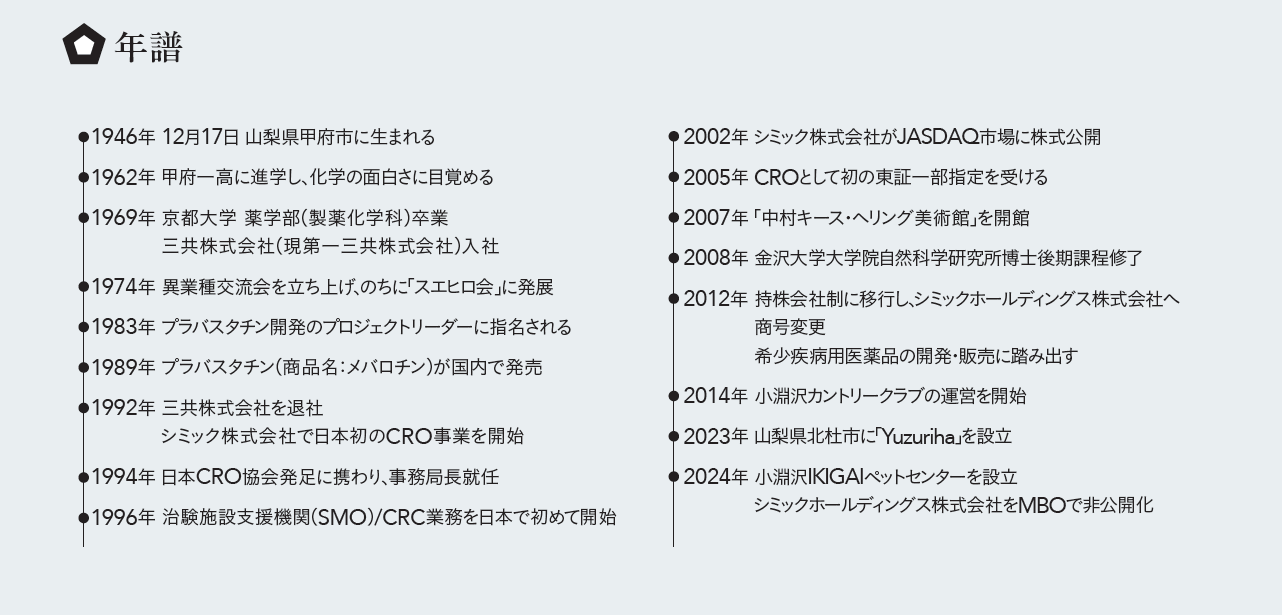 中村前会長はイノベーターとして優れた手腕を発揮しながらもRespect each Otherの精神を体言して、立場や役職に関わらず誰に対しても対等に向き合い、相手から学ぼうとする姿勢を崩しませんでした。経営者としての考え方や苦悩を後進に伝える場として「中村塾」を開講し、未来のシミックグループを支える人材を数多く輩出したことも、大きな功績の1つです。