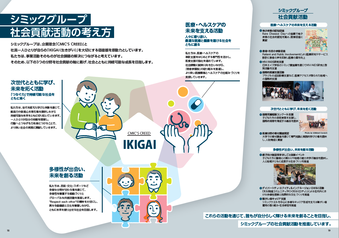 シミックグループは、企業理念「CMIC’S CREED」と社員一人ひとりが自らの「IKIGA( 生きがい)」を大切にする価値観を原動力としています。