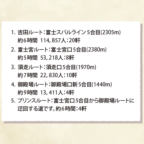 富士登山ルートは5つあります。各ルートの登山口(5合目)の標高と頂上までの所要時間、2024年にそれぞれのルートを利用した登山客数、山小屋の数を示します。なお、同じ5合目でも標高が違います。